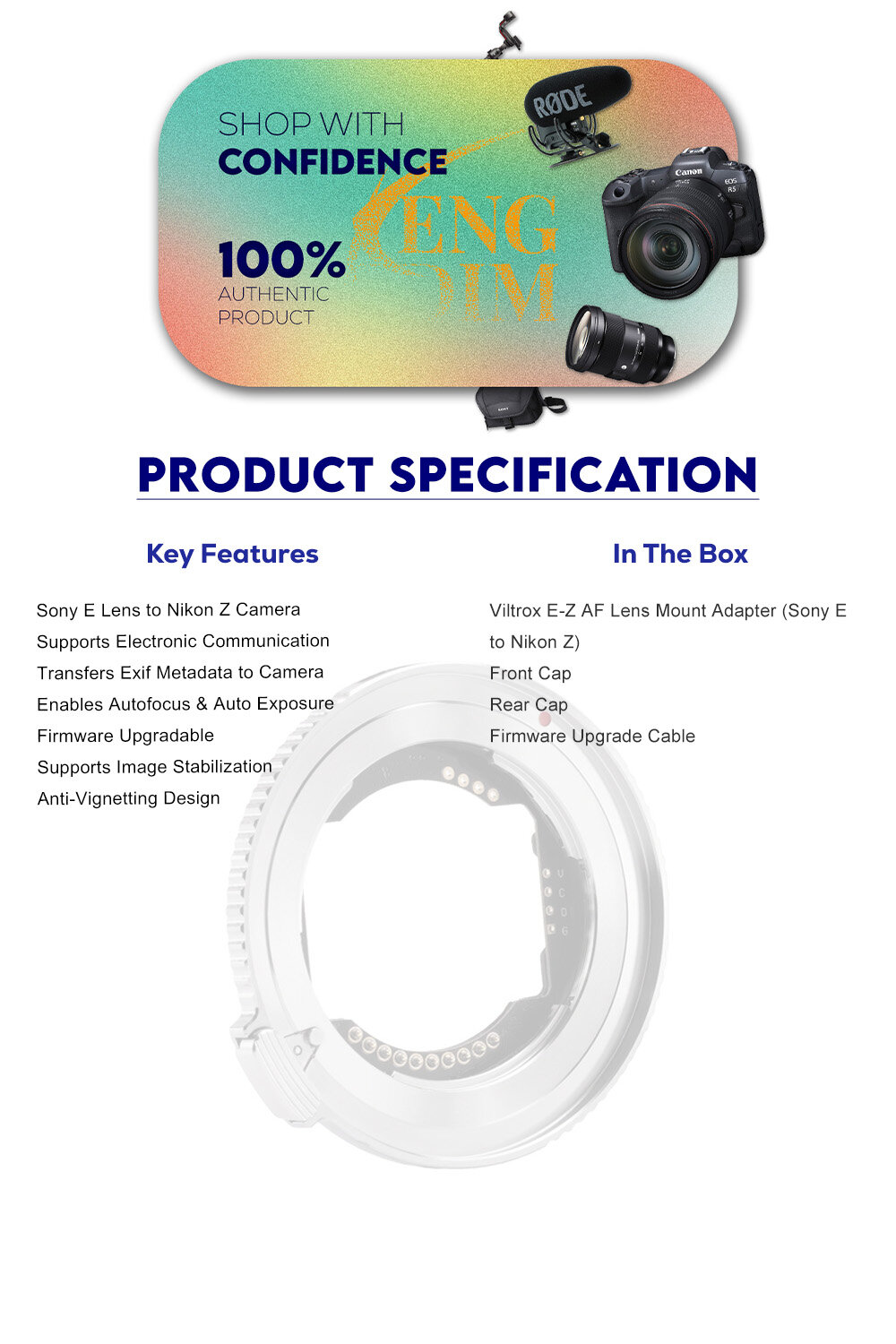 The Viltrox E-Z AF Lens Mount Adapter expands your lens options, bringing a broad suite of Sony E-mount lenses into compatibility with Nikon Z cameras. Its autofocus support delivers fast and precise focus while also offering aperture control to adjust the setting through the camera body or directly on the lens. Built-in EXIF data transmission records essential shooting parameters, streamlining post-production and editing processes. The adapter also supports lens or camera body stabilization, customizable button functions, compatibility with multiple focus modes, and firmware upgrades.