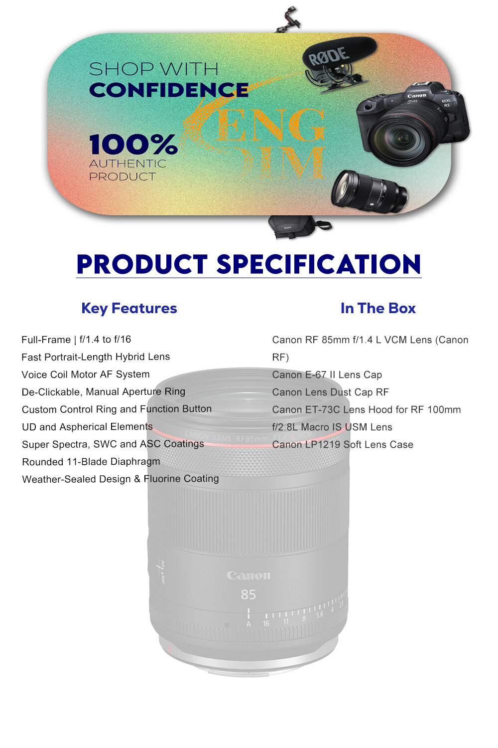 Built for photographers and videographers alike, the Canon RF 85mm f/1.4 L VCM is a fast short-telephoto prime lens with a function-first build that caters to the hybrid nature of modern image-making, emphasizing high image quality, responsive AF, minimized focus breathing, and intuitive, silent, and customizable handling.