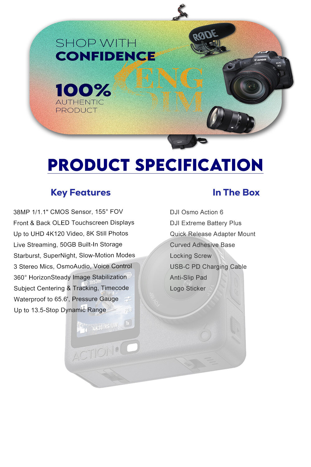 Capture steady, pristine video footage in up to 4K120 resolution wherever you are with the Osmo Action 6 Standard Combo from DJI. The Osmo Action 6 features a new 1/1.1" square sensor, Starburst mode, a variable f/2 to f/4 aperture, and it now has 50GB of internal storage, and it is more cold resistant. It maintains its high-bright dual OLED screens, RockSteady and HorizonSteady stabilization systems, a 38MP sensor, a 4-hour battery life, and a waterproof camera body with a water pressure gauge. Other features include 8K stills, subject centering/tracking, OsmoAudio support, raw footage capture, a 155° field of view, and an SD card slot that supports up to 1TB cards.