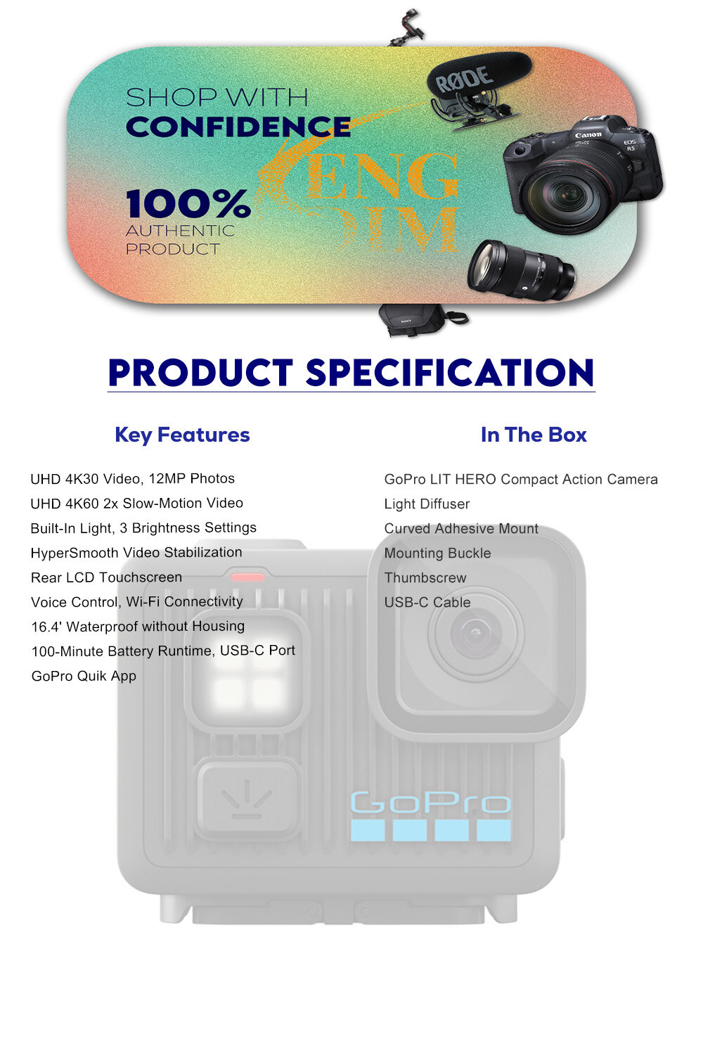 The GoPro LIT HERO is a compact action camera with a built-in light capable of recording UHD 4K video in practically any adventure application, thanks to its lightweight and rugged design. Within its compact form factor, the LIT HERO boasts HyperSmooth stabilization, Voice Control, integrated Wi-Fi, and Quick app control. A rear LCD touchscreen helps frame your shots while toggling between capture modes and settings. The camera itself weighs just 3.3 oz, capable of being slipped inside a pocket or mounted on various configurations with ease.