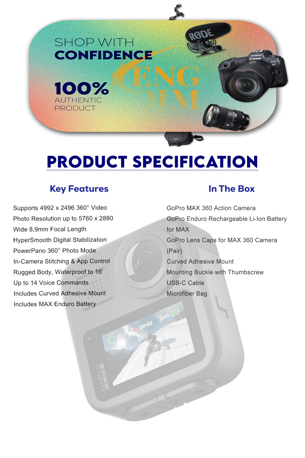 Swap between panoramic 360° images and high-resolution single-lens images with a single device using the GoPro MAX2 360 Action Camera. With opposite side lenses that can be toggled between single- and dual-lens modes, the MAX2 can record up to 8K30 360° video and 4K60 single-lens video. The camera can also take 29MP 360° photos and 12MP single-lens photos. An upgraded Enduro battery with a 1960mAh capacity keeps the camera running for longer shoot days. Built-in Wi-Fi 6 and Bluetooth 5.3 connectivity make for fast file transfer directly to your smartphone using the GoPro Quik app.