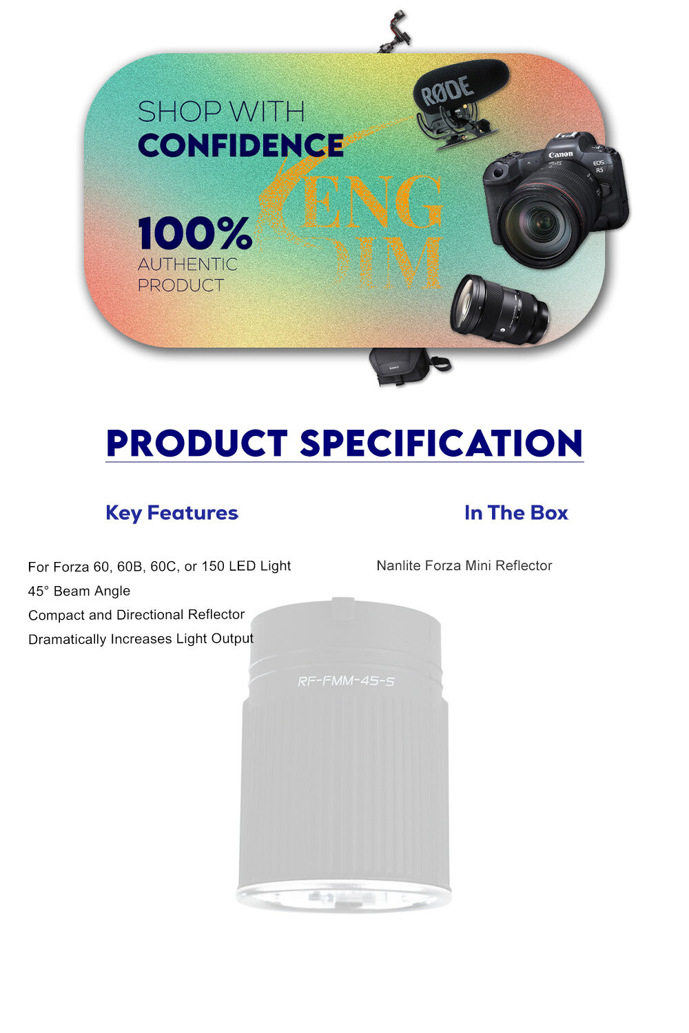 This Forza Mini Reflector from Nanlite is a compact and directional reflector that dramatically increases the output of a Forza 60, 60B, 60C, or 150 LED light. Identical to the reflector that comes with the Forza 60C, it features an FM mount and adds a unique new light shaper to the family with a tight 45° beam angle.