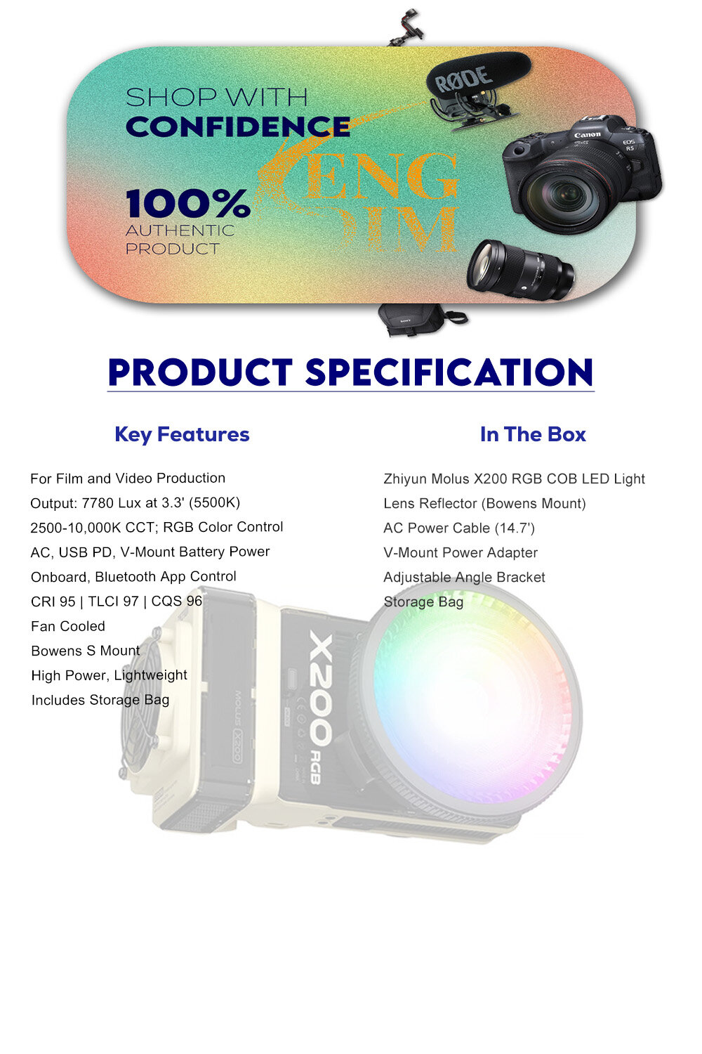 Remarkably bright while only weighing 1.8 lb, the Molus X200 RGB COB LED Light from Zhiyun is a high-power RGB LED light for creators both on the go and in the studio. With a Bowens mount to attach the included lens reflector as well as other Bowens accessories and a 2500 to 10,000K CCT with full RGB color control, it's easy to shape the 7780 lux max output to suit your needs. Control the light via an onboard LED display with two rotary knobs or by Bluetooth through the app. Power the light with the included AC adapter cable, USB PD, or a V-mount battery. A back-pressure fan cooling system delivers powerful performance in a slim package while remaining quiet during operation.