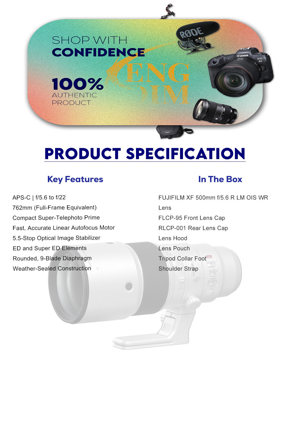Offering FUJIFILM's longest prime lens coverage yet, the XF 500mm f/5.6 R LM OIS WR Lens brings distant subjects like birds, sports, and other wildlife within your reach, offering sharp, continuous focus with subject separation and blurred background effects. The full-frame equivalent 762mm lens achieves this image quality while keeping its size and weight to a minimum, helped by 5.5 stops of optical image stabilization to produce results that match the resolving power of X-series 40.2MP sensors.