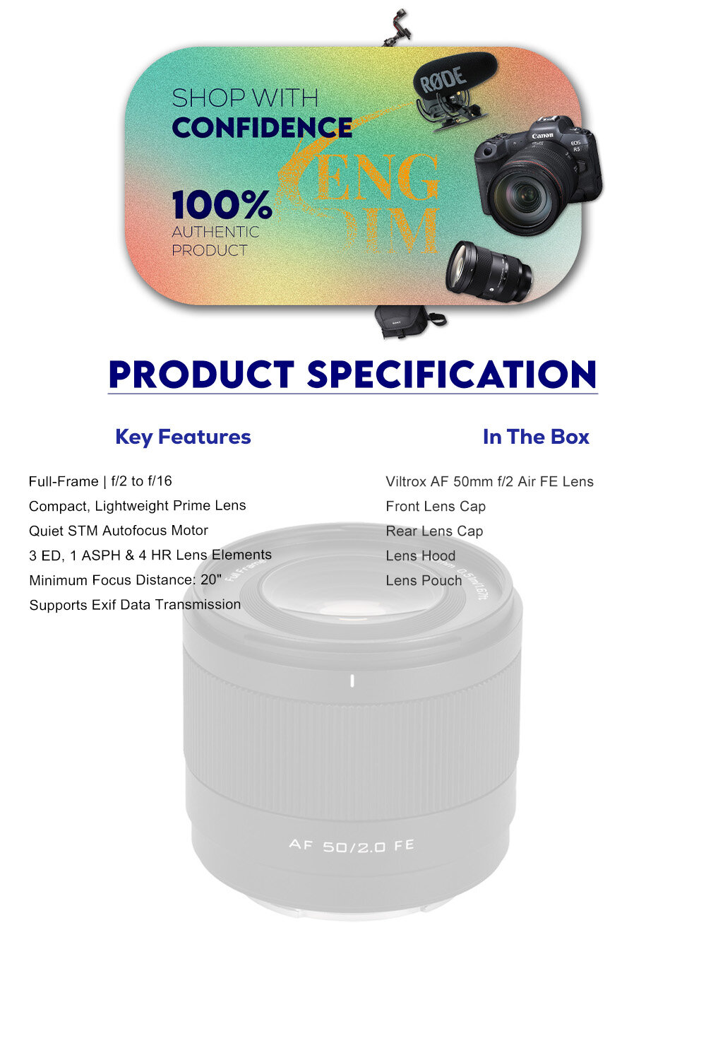 Coupling a classic, versatile focal length with a lightweight design, the AF 50mm f/2 Air FE Lens from Viltrox for Sony E-mount full-frame digital cameras is a prime well-suited for everyday photography. Quick and quiet autofocus performance is provided via its STM focusing motor, making it reliable for both photo and video applications. Its f/2 maximum aperture allows working in dimly lit environments and helps to create flattering bokeh. Optical aberration and image distortion are reduced by the incorporated extra-low dispersion (ED), high-refractive (HR), and aspherical (ASPH) lens elements. Exif data transmission is supported as well as multiple camera shooting modes.