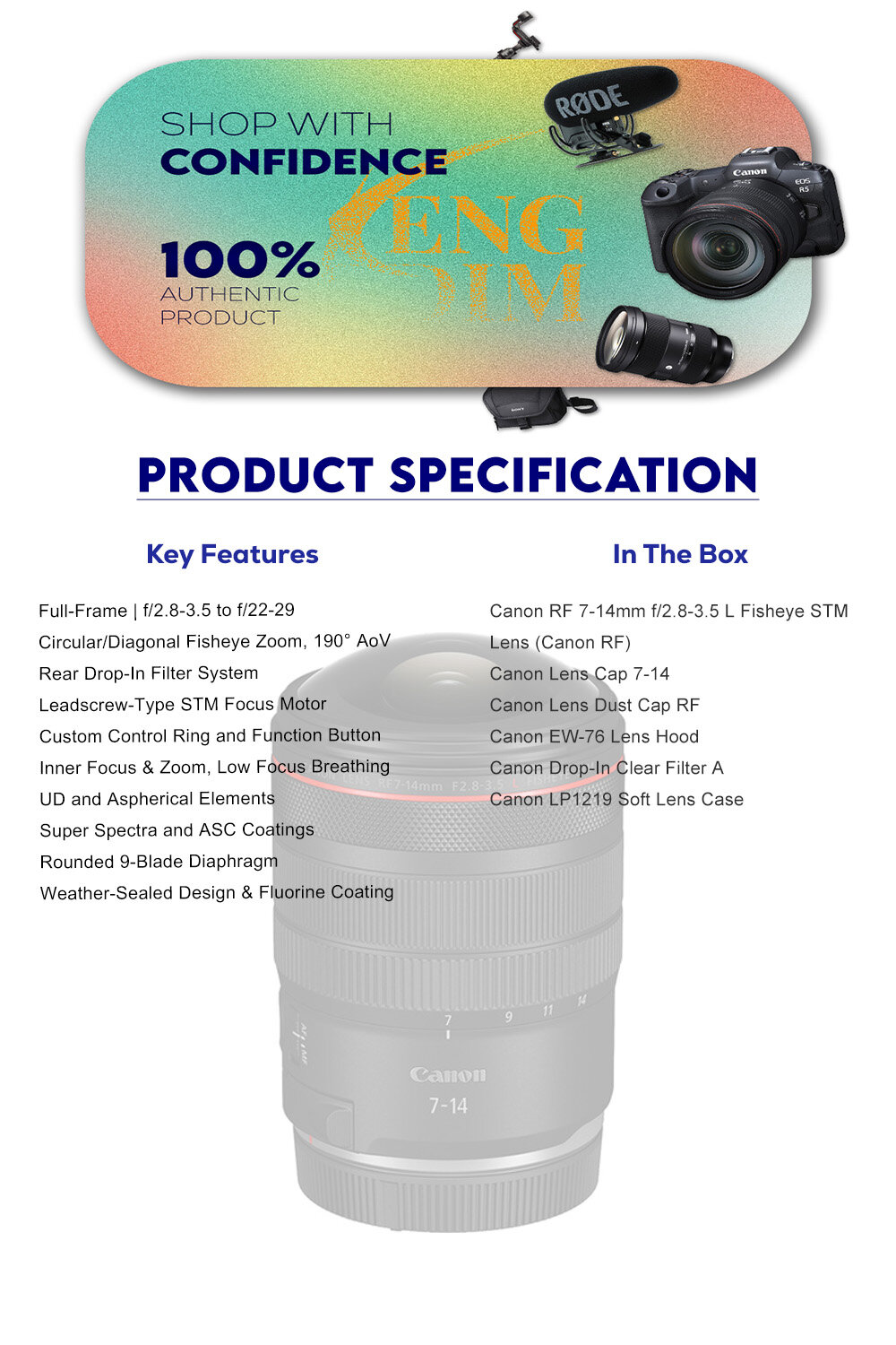 Combining a huge field of view with distinct fisheye rendering, the Canon RF 7-14mm f/2.8-3.5 L Fisheye STM is an ultra-wide zoom for creating striking, dynamic photos and videos. The first fisheye lens for the RF series, this lens brings an immensely wide 190° angle of view, both circular and diagonal coverage depending on focal length and format, and a host of convenient new design details for working with the unique lens.