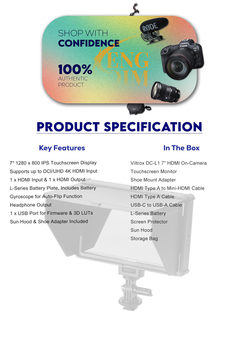 The lightweight DC-L1 7" HDMI On-Camera Touchscreen Monitor from Viltrox provides professional monitoring in a sharp 7" display suitable for outdoor use with a 1280 x 800 resolution. The DC-L1 supports up to DCI/UHD 4K video input via mini-HDMI. It provides an HDMI loop-through output to send video to another monitor. Other features include custom 3D LUTs, L-series and USB power options, and multiple included accessories.