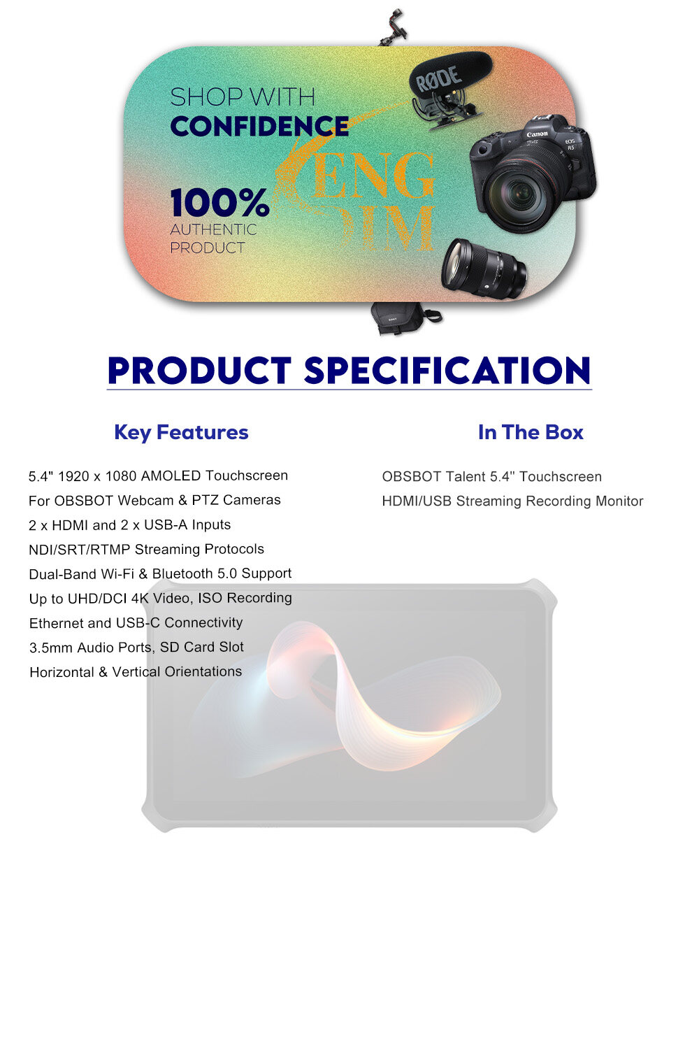 Designed to fit into the OBSBOT webcam and PTZ ecosystem, the Talent 5.4" Touchscreen HDMI/USB Streaming Recording Monitor can stream, encode, record, and switch up to UHD/DCI 4K resolution video. The monitor features a 1920 x 1080 native resolution AMOLED that measures 5.4" and has a maximum brightness of 350 cd/m². Multiple connectivity options, from HDMI and USB to NDI and SRT/RTMP, make integrating the Talent into your preexisting streaming workflow a breeze. Built-in production features create an all-in-one solution for most streaming applications. The monitor can also stream in both horizontal and vertical orientations.